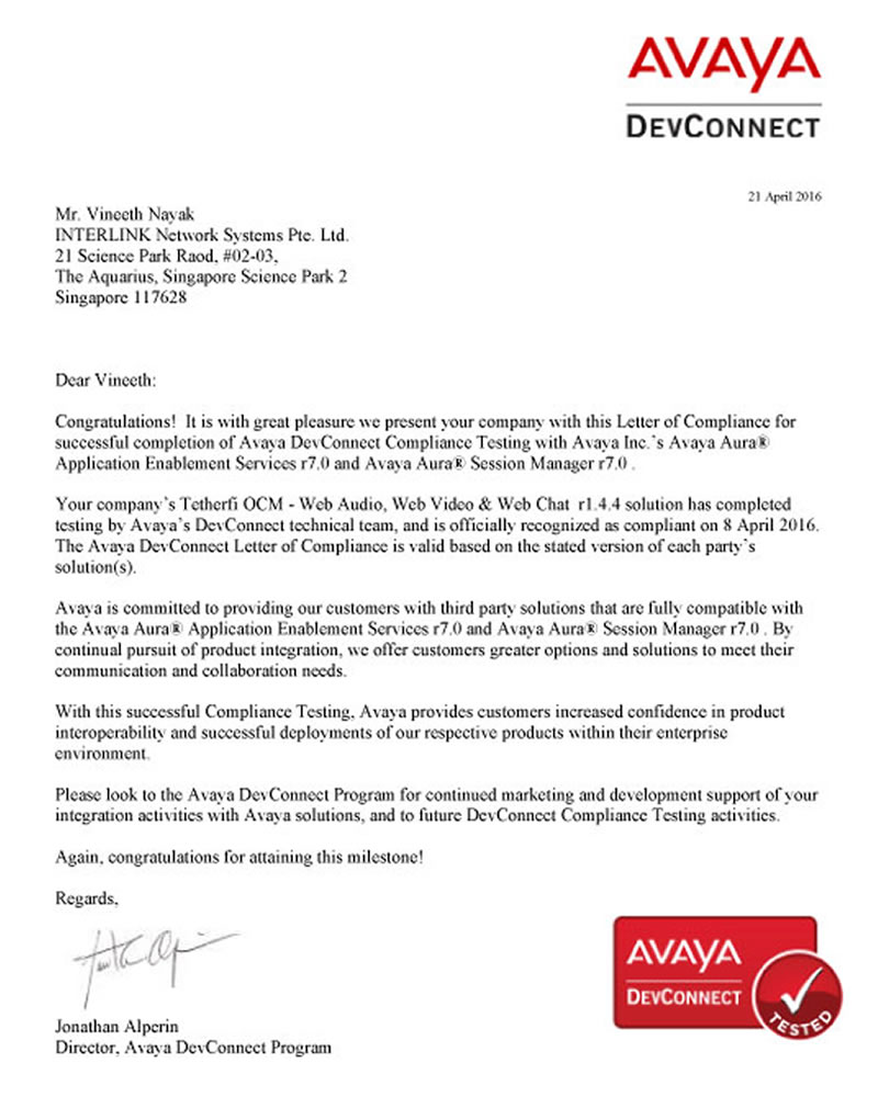 Tetherfi™ OCM Video, Audio and Chat recognised compliant with Avaya Aura® Communication Manager R7.0 and Avaya Aura® Session Manager R7.0 by Avaya DevConnect.